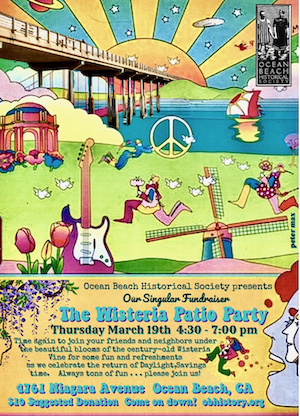 Join us as the Ocean Beach Historical Society celebrates Daylight Saving Time at the Wisteria Patio Cottage, under the century-old Wisteria vines, on Thurs., March 19, 2026, 4:30 – 7:00 PM at 4761 Niagara Ave., in O.B. The over-a-century old Wisteria Vines cover the patio with purple blossoms! The event included tasty treats, unique historical photos, artifacts, books and gifts for sale and surprises. This OBHS party & fundraiser shows wonderful Ocean Beach historical photos. Please join us at this wonderful event.