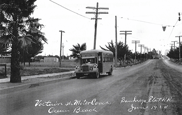 Photo: Replacing the old OB Loop of the Point Loma Railroad, San Diego Electric Railway ran one of the first bus lines in San Diego along Voltaire Street. June 1924. SDER
