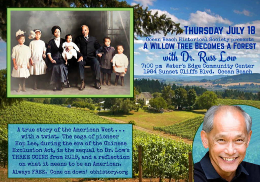 Thurs., July 18, 2024The Ocean Beach Historical Society presented: A Willow Tree Becomes A Forest, 7 pm, at Waters Edge Community Center, 1984 Sunset Cliffs Blvd. OBHS Favorite