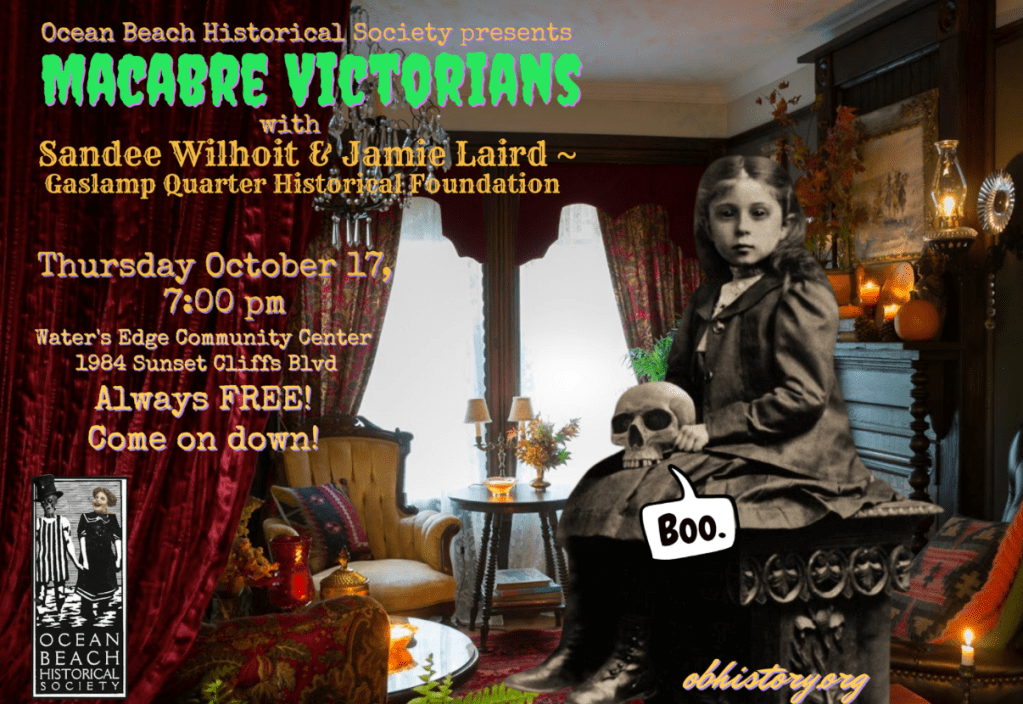 Oct.17, 2024, Halloween came early… as the Ocean Beach Historical Society presented Macabre Victorians Thurs., at Waters Edge Community Center, 1984 Sunset Cliffs Blvd., O.B. Presenters drew back the dark veil and so we could take a glimpse into Victorian Macabre with Gaslamp Quarter Historical Foundation Historian Sandee Wilhoit and GQHF volunteer Jamie Laird as they delve into some of the bizarre superstitions, intricate customs, and fascinating practices of our Victorian ancestors surrounding mourning and death. What were the highly regarded customs of “dressing for success” for both the new widows, and the new corpses? Did the Victorian obsession with “proper” mourning rituals influence the rise of Spiritualism, and what elements of Spiritualism still captivate our society today? What was the fascination behind “Post-Mortem Photography” and “Mummy Unwrapping Parties?” The answers awaited that night of Victorian Macabre! Some of us dressed in Victorian Macabre. All OBHS programs are free!