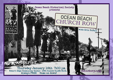 Eric DuVall gave a great Ocean Beach Historical Society program on JAN. 16, 2025, about “OCEAN BEACH’S HISTORIC CHURCH ROW” at Water Edge Community Center, 1984 Sunset Cliffs Blvd., as we kicked off another year of our Free Monthly lecture series. OBHS president Eric DuVall took a look back at the development of the community center of Ocean Beach, the lovely and iconic gateway, known for over a century as Church Row The many churches of Ocean Beach have played a prominent role in the development of the community since OB’s earliest days, several originally holding meetings in tents on the beach!  OB’s Church Row is a rare and wonderful resource which has lasted over 100 years! (Right Photo, Sunset Cliffs’ Church Row in circa 1970).