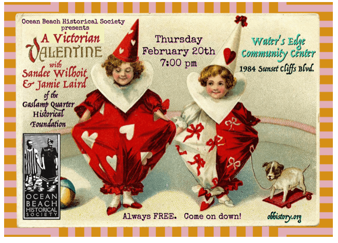 Feb. 20, 2025, at Waters Edge Community Center, 1984 Sunset Cliffs Blvd., The Ocean Beach Historical Society presented: Romantic Victorians: Dating, Marriage, and Love. Lecturers Sandee Wilhoit, GQHF Historian, and Jamie Laird, GQHF volunteer, delved into the intricate customs and traditions surrounding dating, marriage, and love in the Victorian Era. Become versed in the strict courting rules, elaborate Victorian flirting techniques like the “Language of the Fan,” and all that was expected when both parties finally said, “I do.” We learned about Romanticism- a movement that gained momentum in the late 1800s- which emphasized inspiration, subjectivity, and the primacy of the individual and how it not only influenced Art and Literature, but also ideas and romantic notions of the Victorian era. Presenters and others dressed in Victorian Valentine Style. All OBHS Programs are FREE!