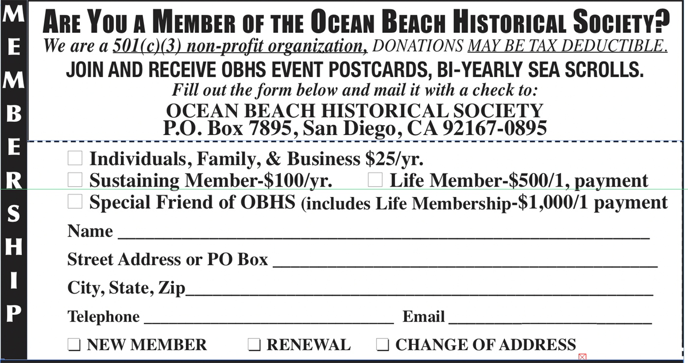 SEND CHECK for DONATIONS or MEMBERSHIPS to: Ocean Beach Historical Society, P.O. Box 7895, San Diego, CA 92167.